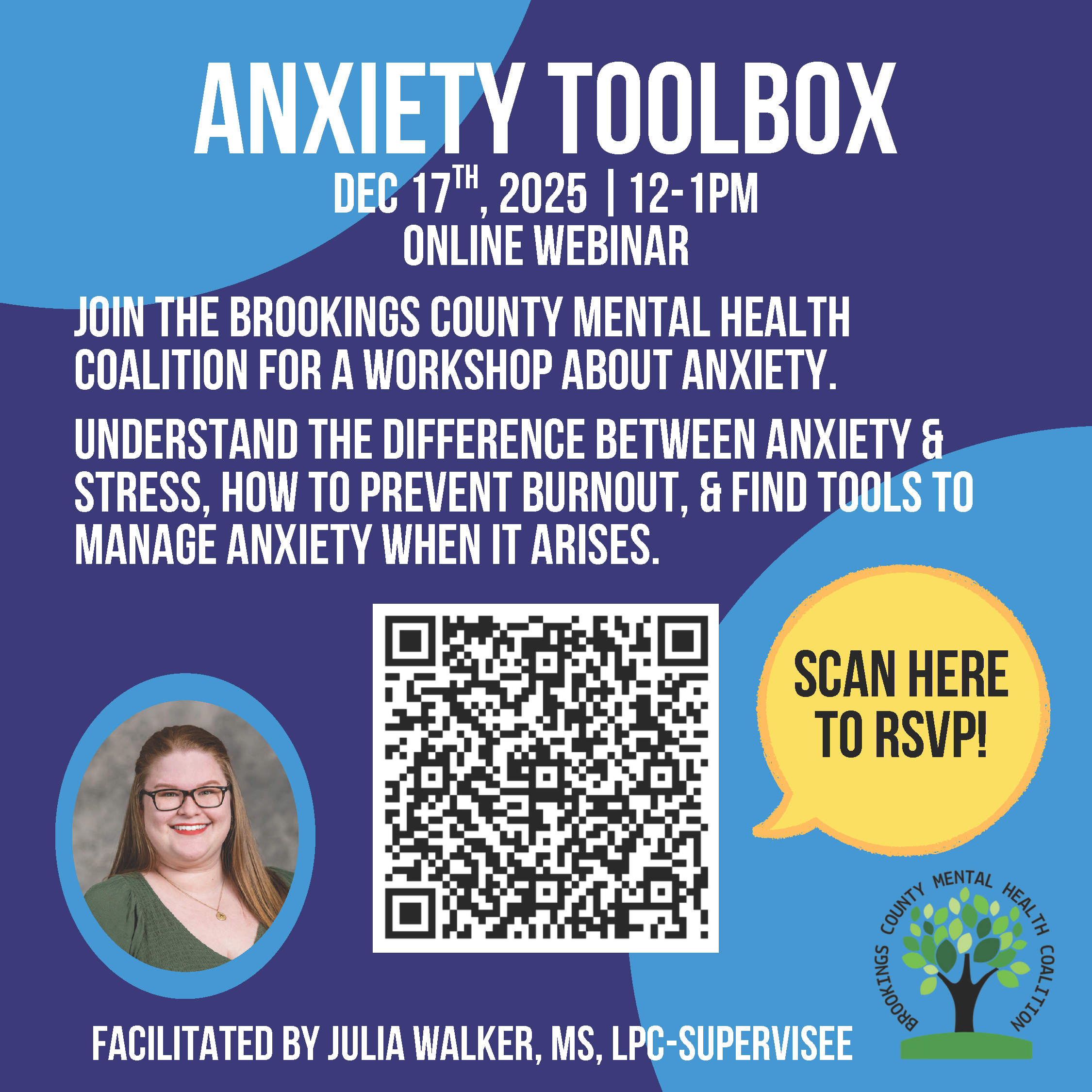 Workshop is facilitated by Julia Walker , MS, LPC-Supervisee with the SDSU Counseling Services and hosted by the Brookings County Mental Health Coalition!