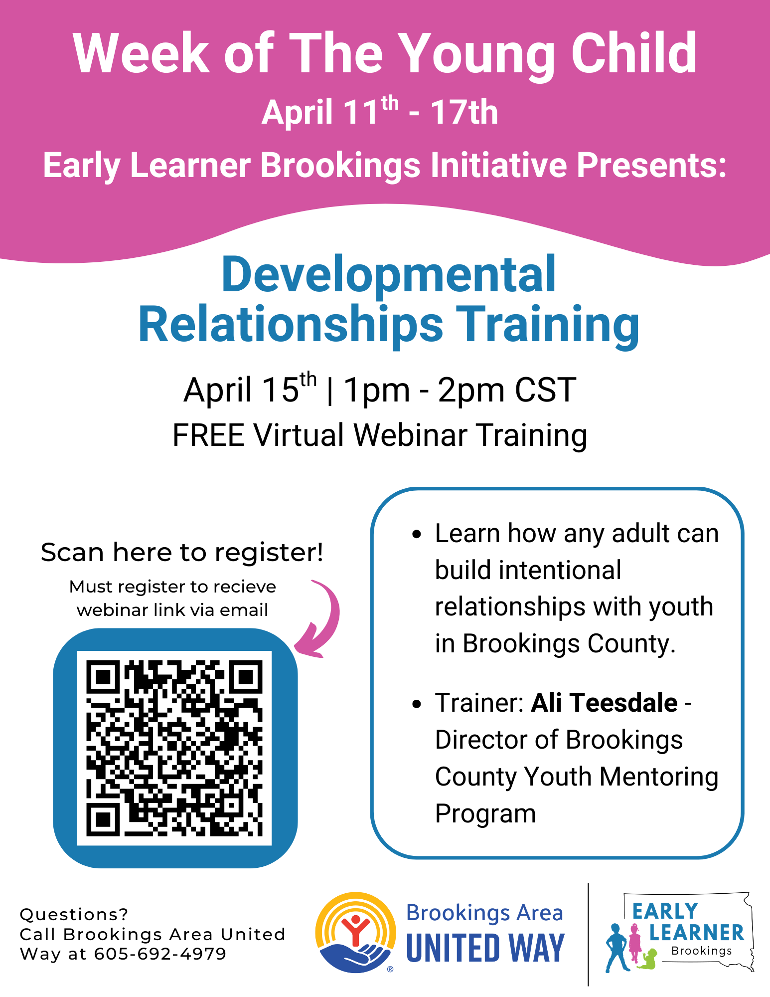 Join the Early Learner Brookings Initiative during the Week of the Young Child for a free virtual training on Developmental Relationships. This one-hour webinar will explore how any adult can intentionally build strong, supportive relationships with youth in Brookings County. The session will be led by Ali Teesdale, Director of the Brookings County Youth Mentoring Program.