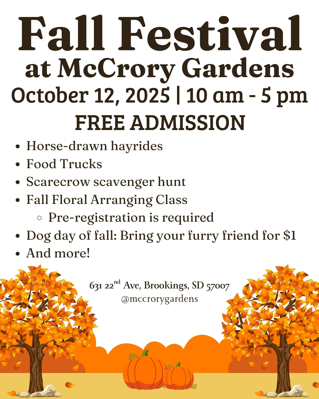 Fall Festival is at McCrory Gardens! From 10 AM – 5 PM on Sunday Oct. 12, enjoy horse-drawn hayrides, food trucks, a scarecrow scavenger hunt, arts classes, dog day of fall, and more! All with FREE admission!