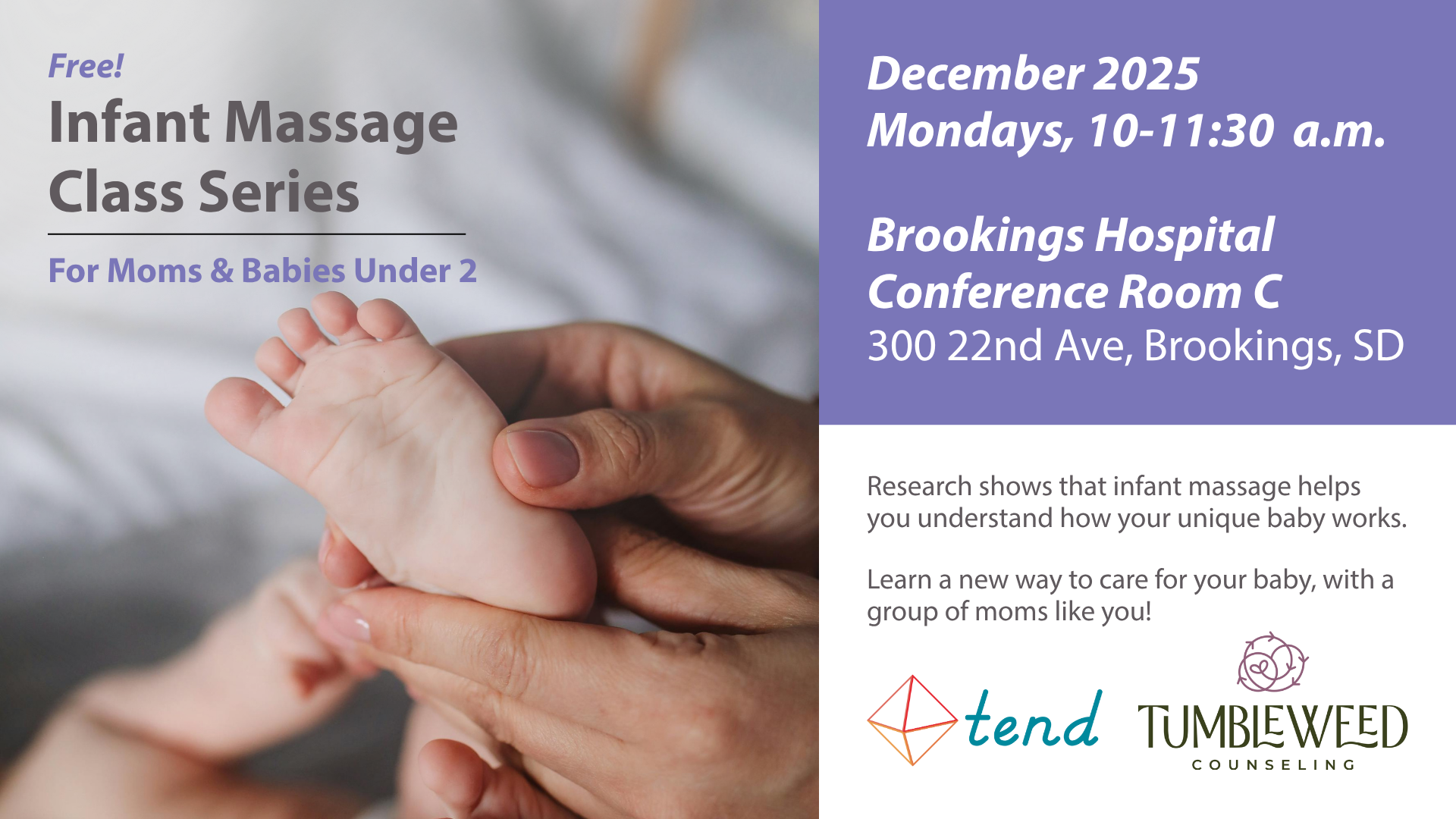 This free infant massage class series will be led by Aysia Platte, MSEd, PMH-C, of Tend, a trained Certified Educator of Infant Massage (CEIM). This opportunity is sponsored by Tumbleweed Counseling, as part of the free weekly Postpartum Wellness Group, held at the Brookings Hospital (300 22nd Ave, Conference Room C) every Monday from 10-11:30 a.m.